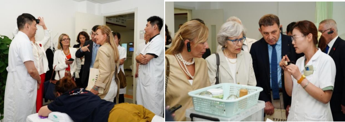 To gain a deeper, firsthand understanding of distinctive Chinese medicine services, Turkish guests toured the hospital's specialized departments including the Tuina Department, Acupuncture & Moxibustion Department, VIP Clinic, and TCM Nursing Clinic. President Jin Tao presented and demonstrated the hospital's intangible cultural heritage therapy TCM Tuina, scalp acupuncture, mang needle, fire needle, warm moxibustion, du moxibustion, gourd moxibustion, medicinal ceramic cupping, bamboo cupping, acupoint patch application, and other characteristic TCM?external therapies. The foreign guests enthusiastically experienced the hospital's signature external therapies, including TCM?tuina, acupuncture & moxibustion, Five Elements energy cups, and ear acupressure patches. They reported significant relief from discomfort and expressed strong appreciation and affirmation of the effectiveness of these Chinese medical treatments. During breaks between sessions, guests savored the unique flavors of herbal tea while immersing themselves in traditional Chinese culture and health philosophies.