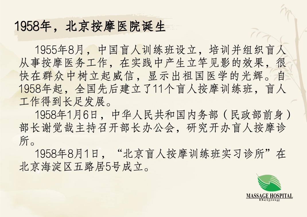 北京按摩醫(yī)院創(chuàng)建于1958年,隸屬中國殘疾人聯(lián)合會,是中國現(xiàn)代盲人醫(yī)療按摩事業(yè)的發(fā)源地、全國盲人醫(yī)療按摩技術(shù)資源中心、北京市三級中醫(yī)醫(yī)院、北京市基本醫(yī)療保險(xiǎn)定點(diǎn)醫(yī)院。醫(yī)院實(shí)行“一院兩址”的運(yùn)營模式。舊址西城院區(qū)建筑為北京傳統(tǒng)民居四合院,坐落于北京市西城區(qū)寶產(chǎn)胡同7號,主要業(yè)務(wù)科室有推拿科、針灸科、康復(fù)科、兒科、內(nèi)科、治未病科(特需門診)等。新址朝陽院區(qū)坐落于朝陽區(qū)武圣北路10號院,編制床位300張,將陸續(xù)建設(shè)推拿治療中心、康復(fù)治療中心、針灸治療中心、疼痛治療中心、治未病中心、兒童治療中心、中醫(yī)護(hù)理中心等業(yè)務(wù),努力建設(shè)成為一所集醫(yī)療、科研、教學(xué)、康復(fù)為一體的專業(yè)化、規(guī)模化、現(xiàn)代化三級甲等中醫(yī)醫(yī)院。